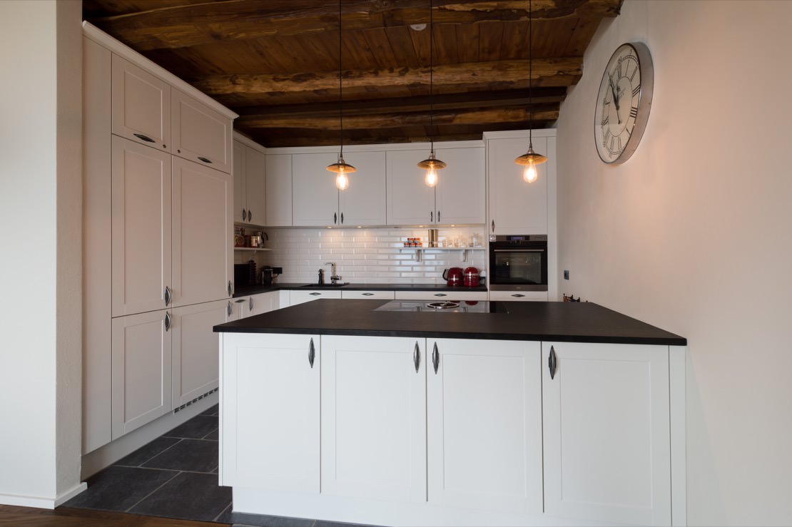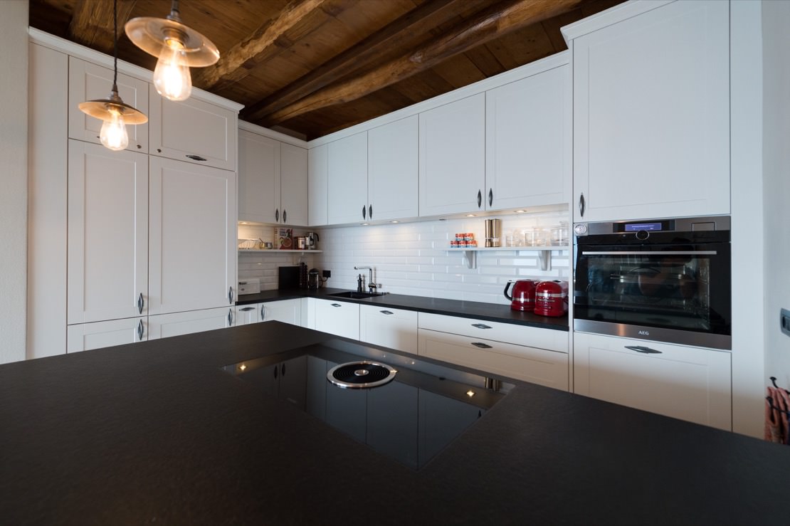 Our high quality kitchen is located directly in the living and dining area. It features a cooking island with induction cooker and Bora extractor hood, an oven-steamer unit, a fridge and freezer, a dishwasher, a toaster, a kettle, and a Nespresso coffee machine. A water dispenser supplies cooled and carbonated water. In the cupboards you will find everything you need for cooking and eating - pots, pans, cooking utensils, spices, ... along with glasses, plates and cutlery for up to 16 people.