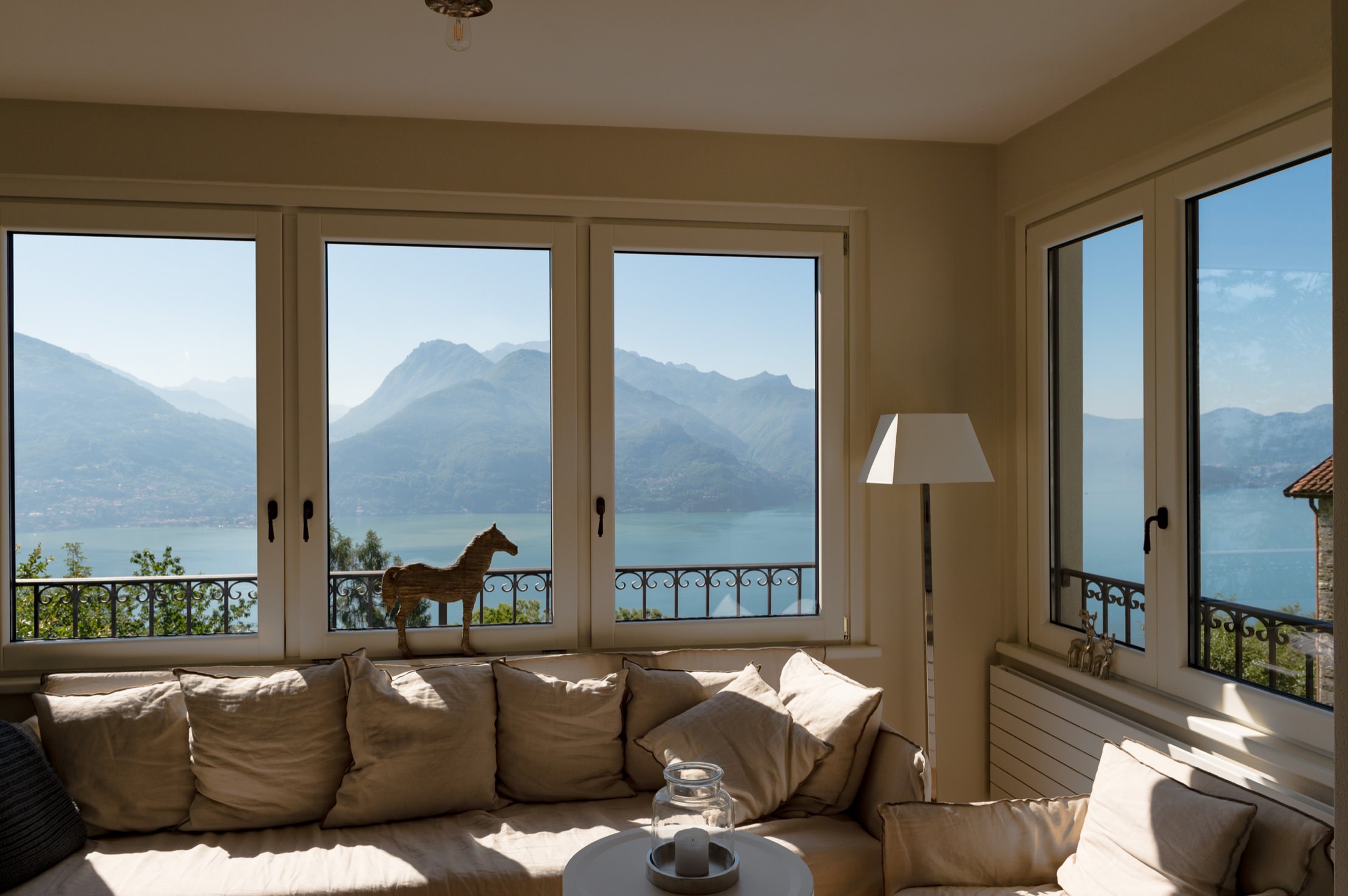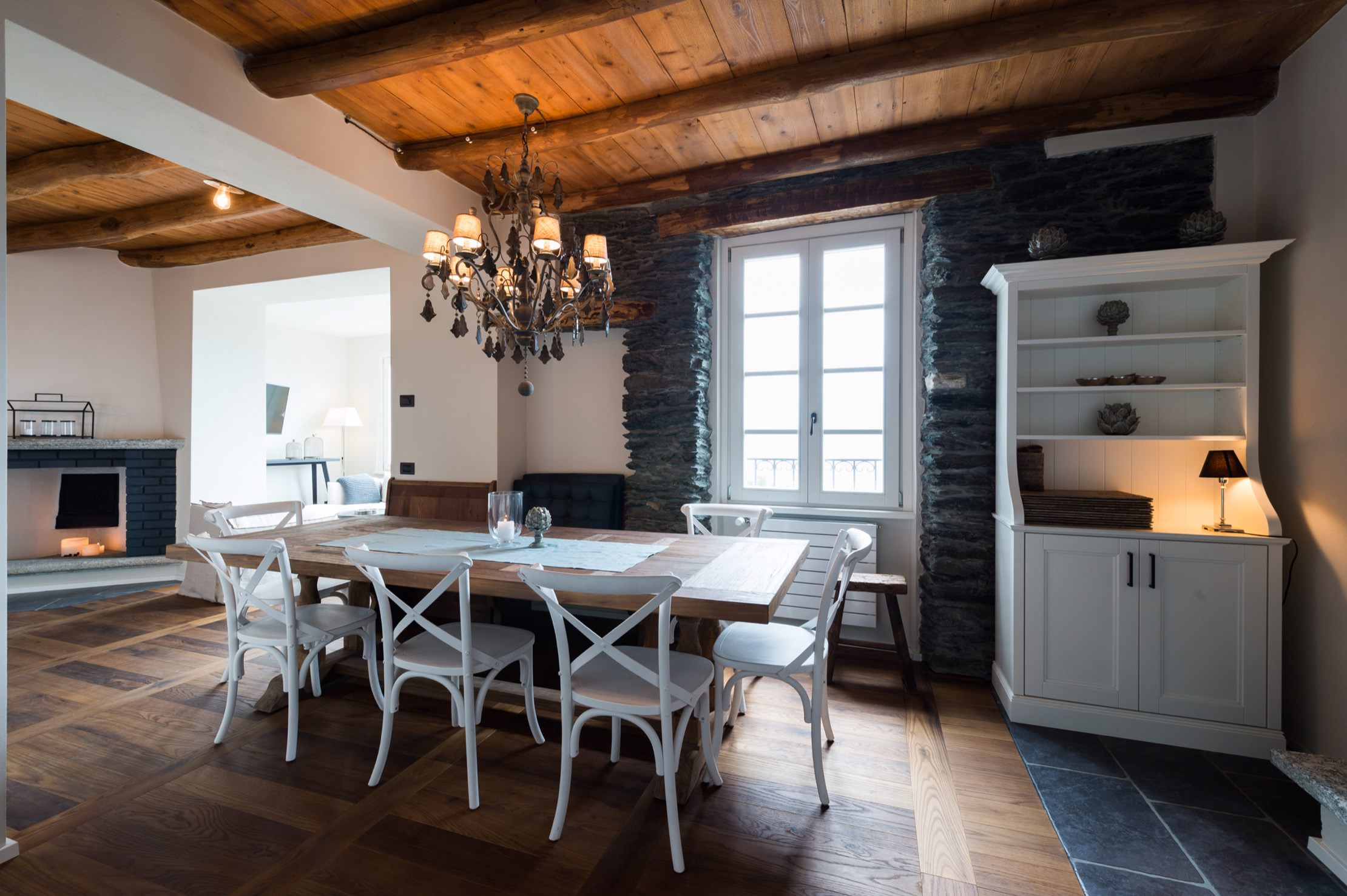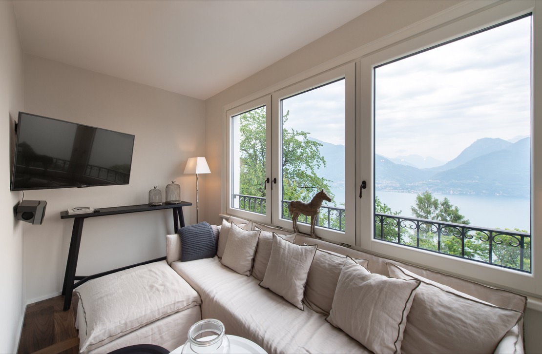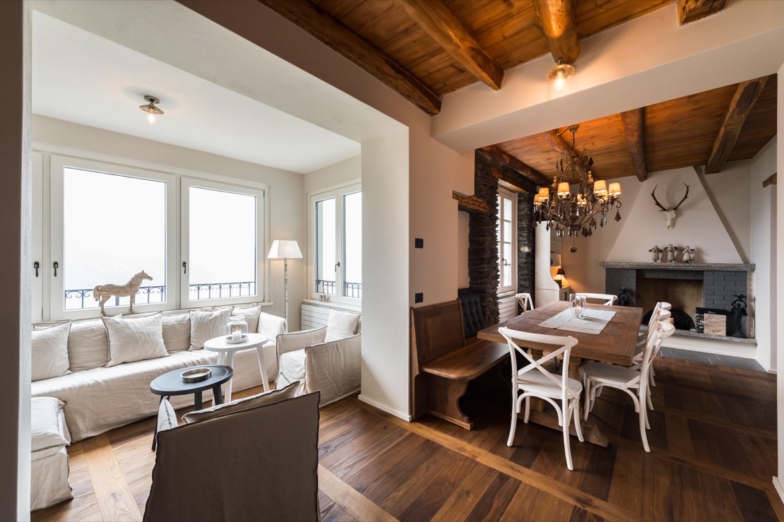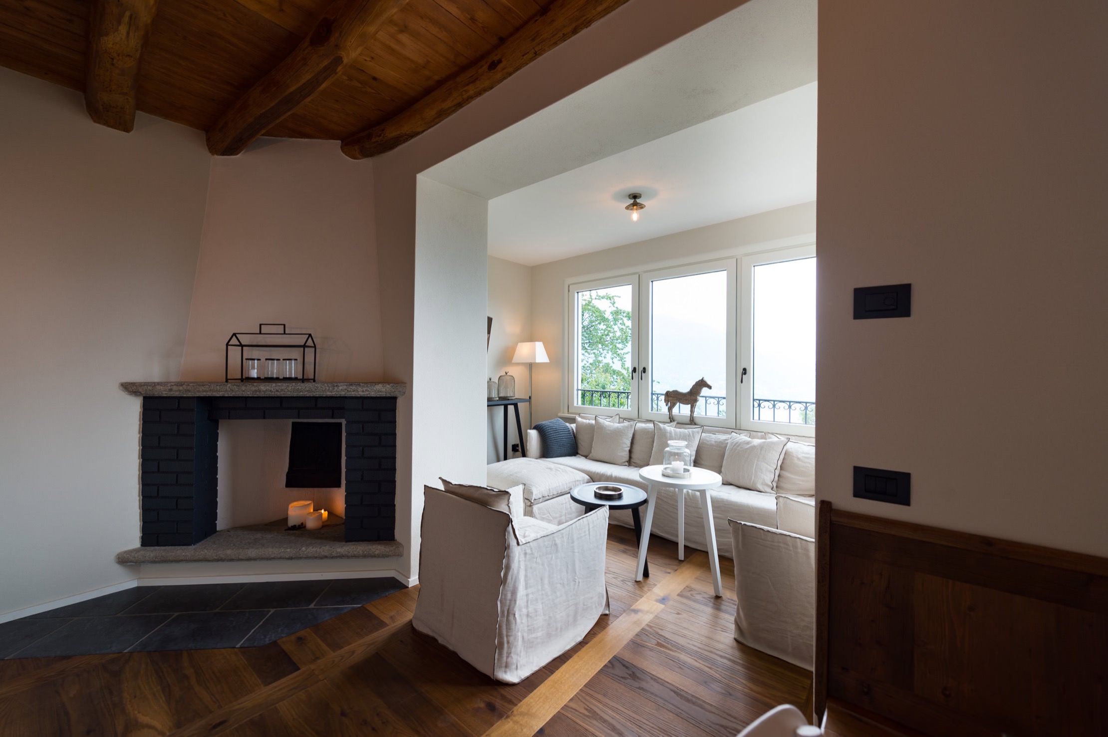 The sofa corner offers a three-seater couch and two armchairs. Here you can enjoy a 180°-view of the beautiful Lake Como. Again, there is an old fireplace (only for decoration, no fire allowed).