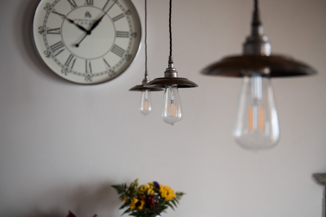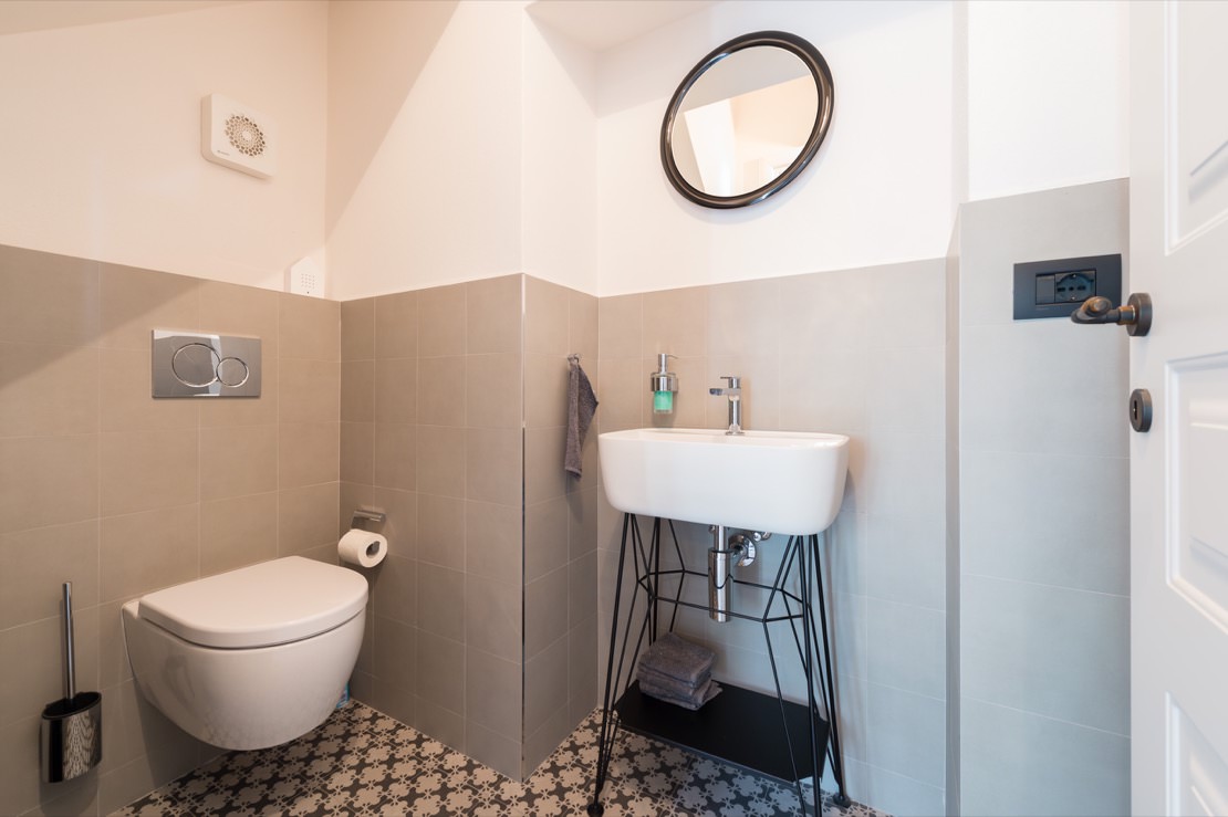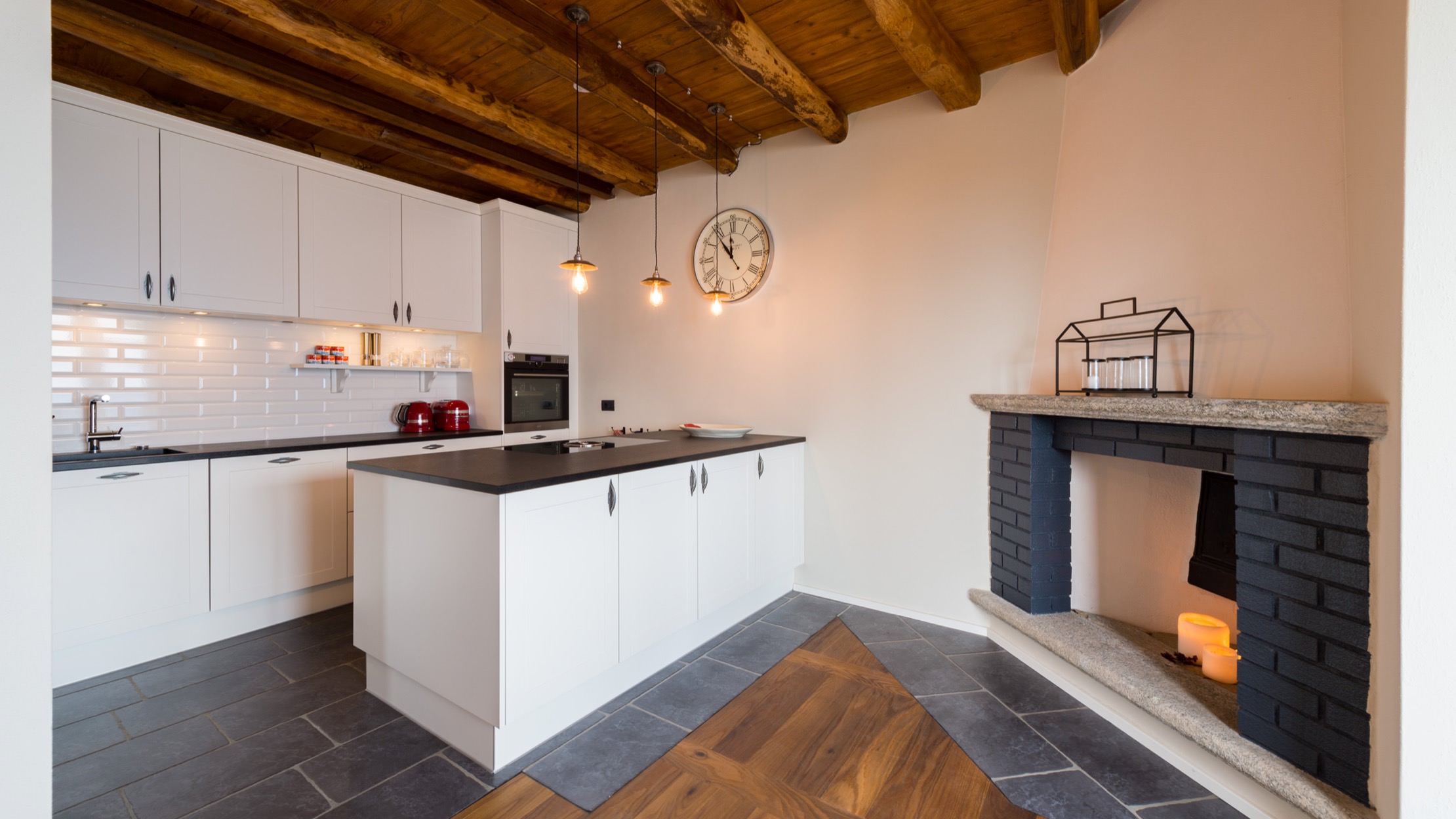 A large table with 6 chairs and a comfortable bench invites to relaxing family meals. An old fireplace (only for decoration, no fire allowed) and high quality lamps provide a cozy atmosphere.
